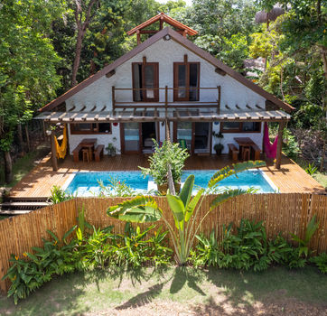 A CASINHA MANDALA 3 nada mais é do que a casinha 1 e a 2 unidas, podendo ser compartilhadas em conjunto, com um grupo maior, e com a vantagem de uma privacidade maior entre 2 casas quando necessário. As cozinhas tem uma ampla bancada com amplas janelas que ficam diretamente voltadas para a área do deck, jardim e piscina. Para as refeições temos a bancada da cozinha e a mesa externa do deck. , ela vai ter um deck continuo e compartilhado, unindo as 2 casinhas de uma forma super interessante! Nossas cozinhas são integradas as piscinas, debaixo de uma matinha que alivia depois de um dia de sol na praia!
